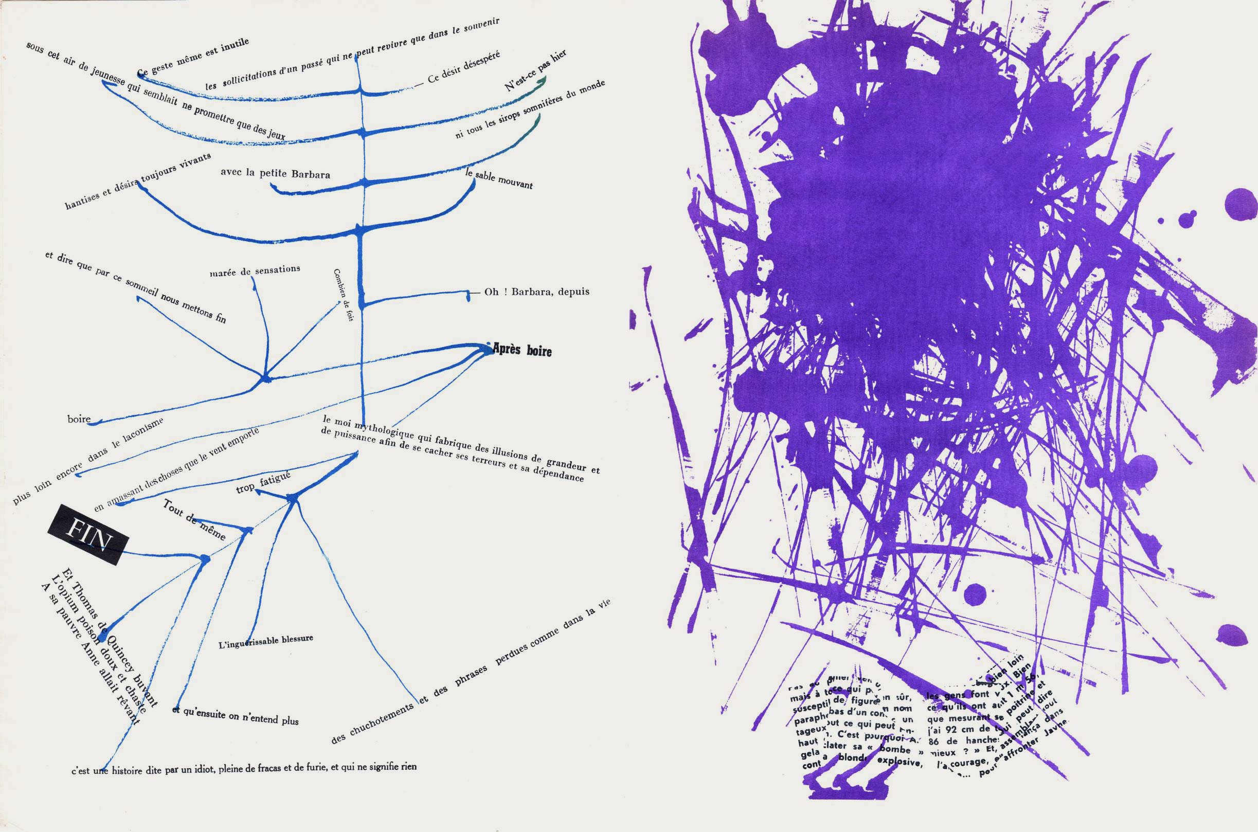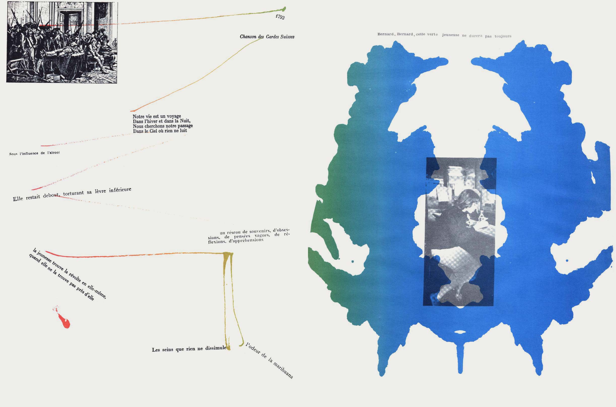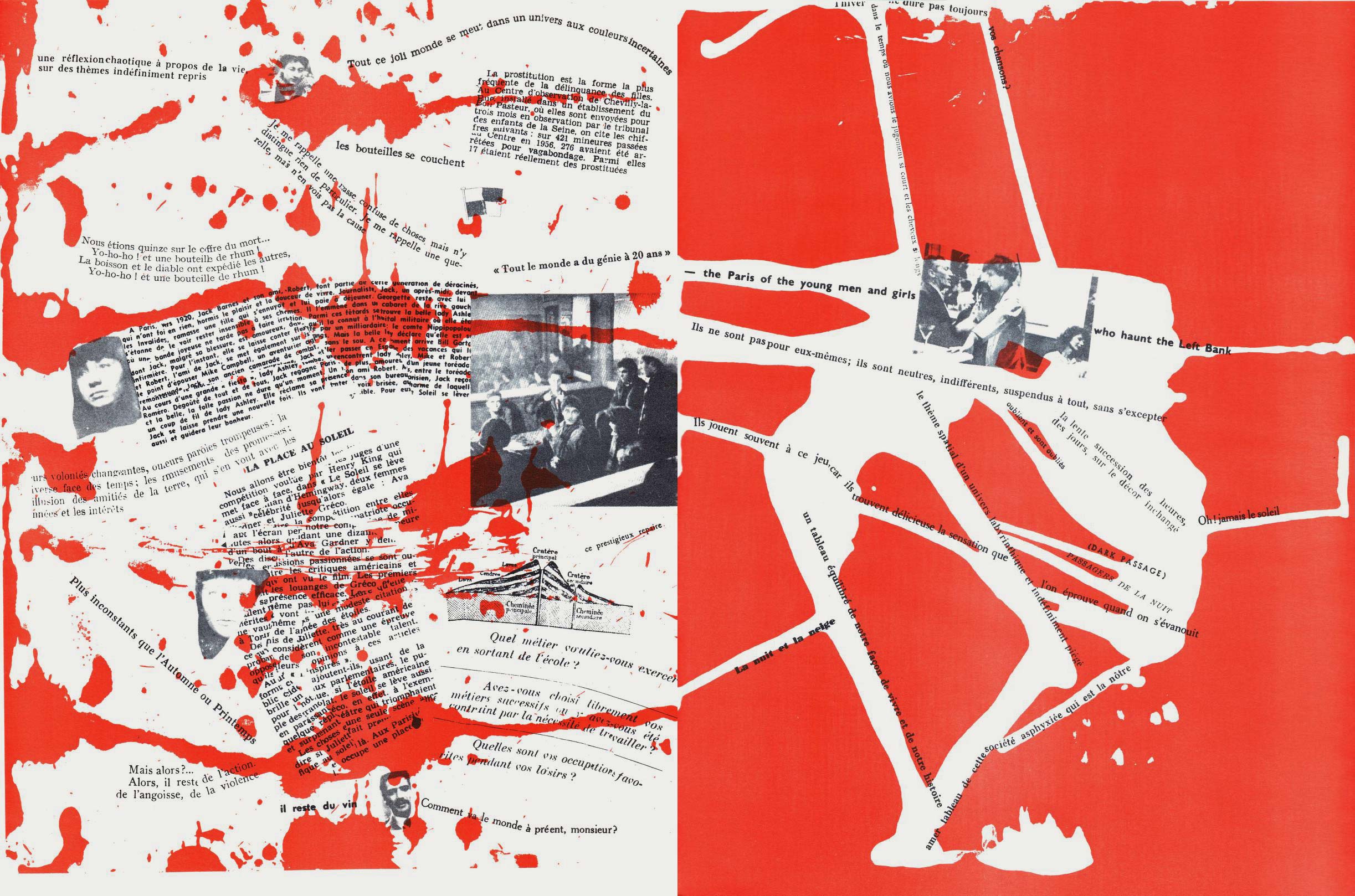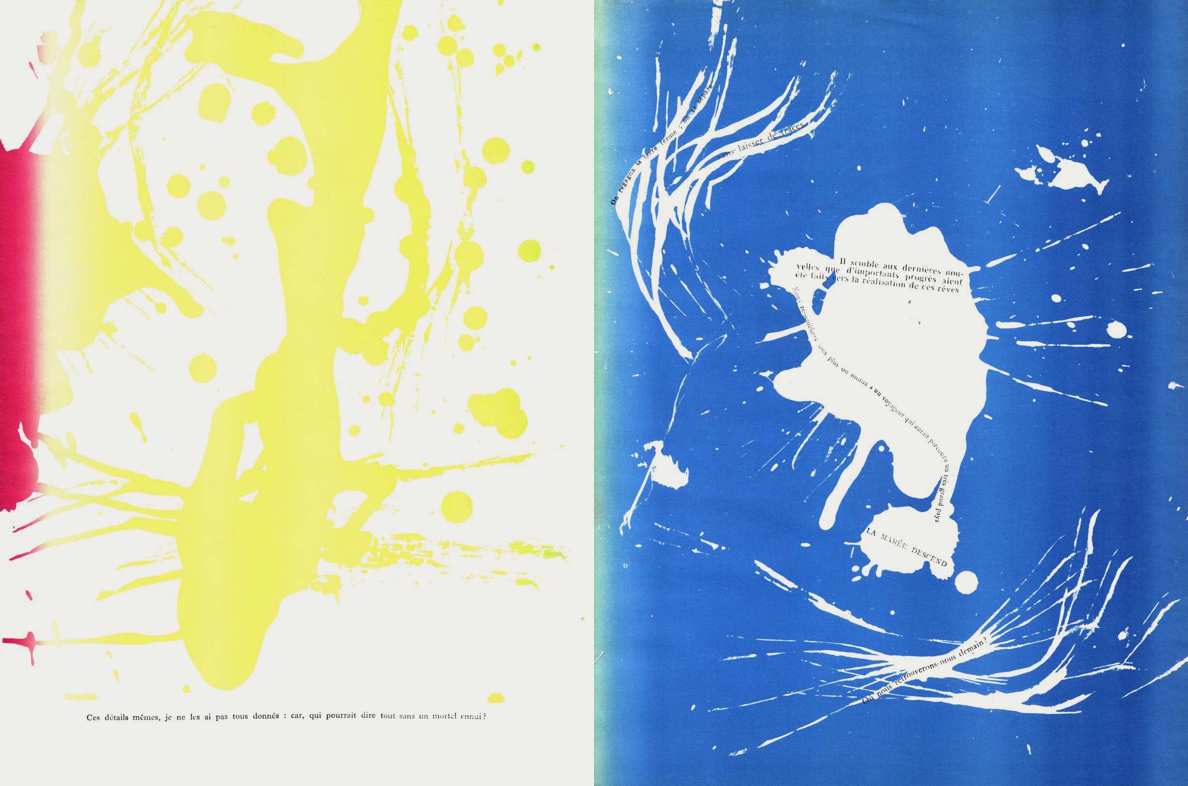 NOTES: Mémoires (Memories) is an artist's book made by the Danish artist Asger Jorn in collaboration with the French artist and theorist Guy Debord. The work contains two separate layers. The first is printed with black ink, reproducing found text and graphics taken from newspapers and magazines. The second layer is printed using coloured inks, splashed across the pages..