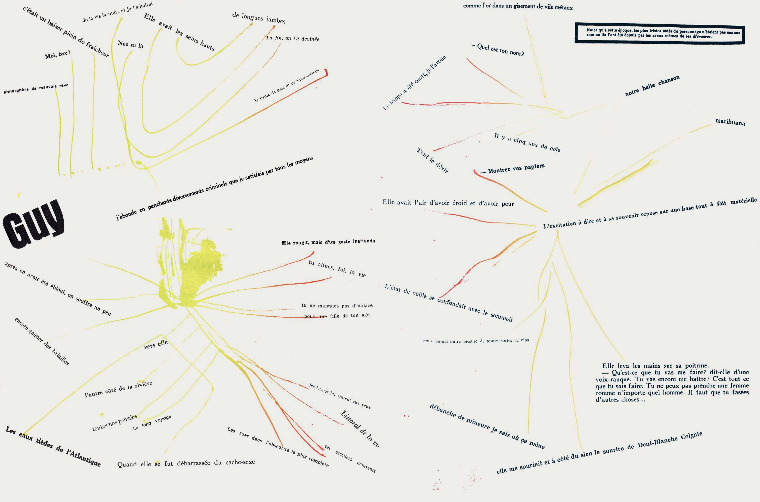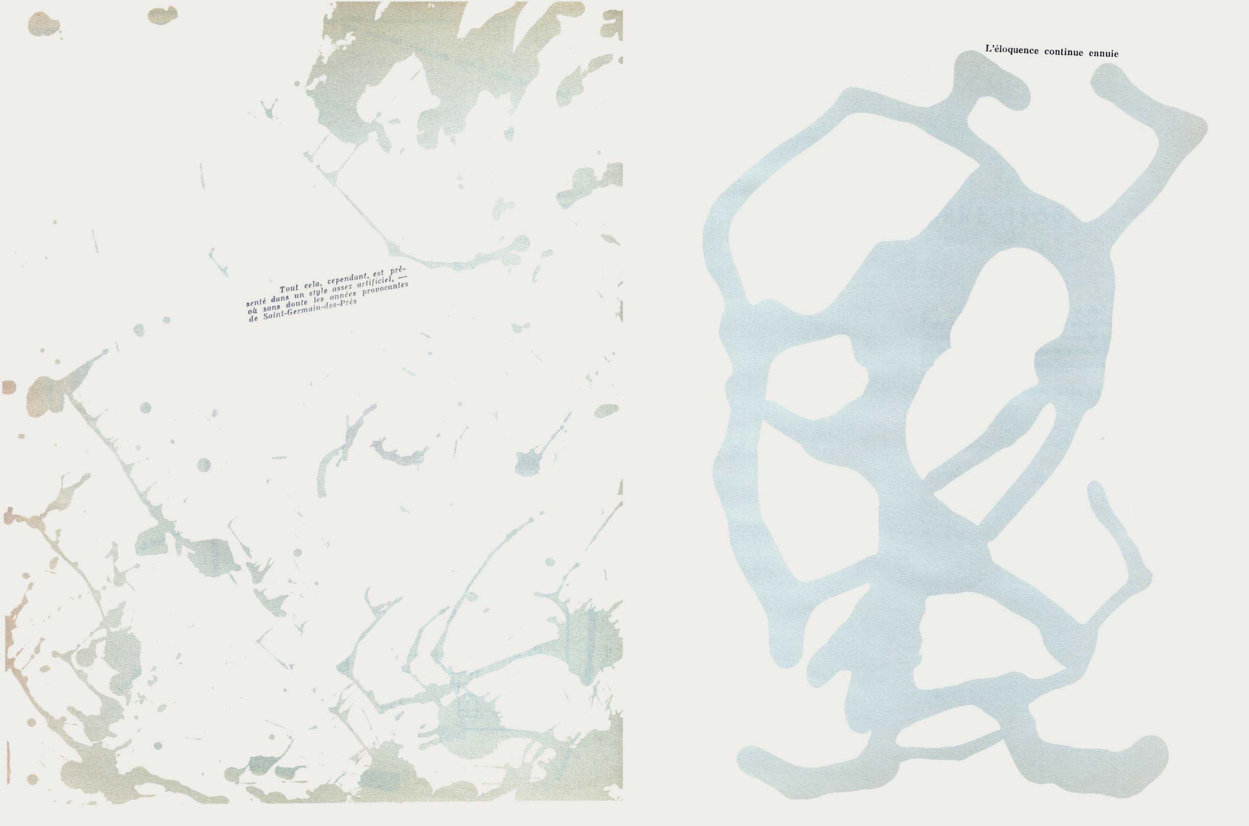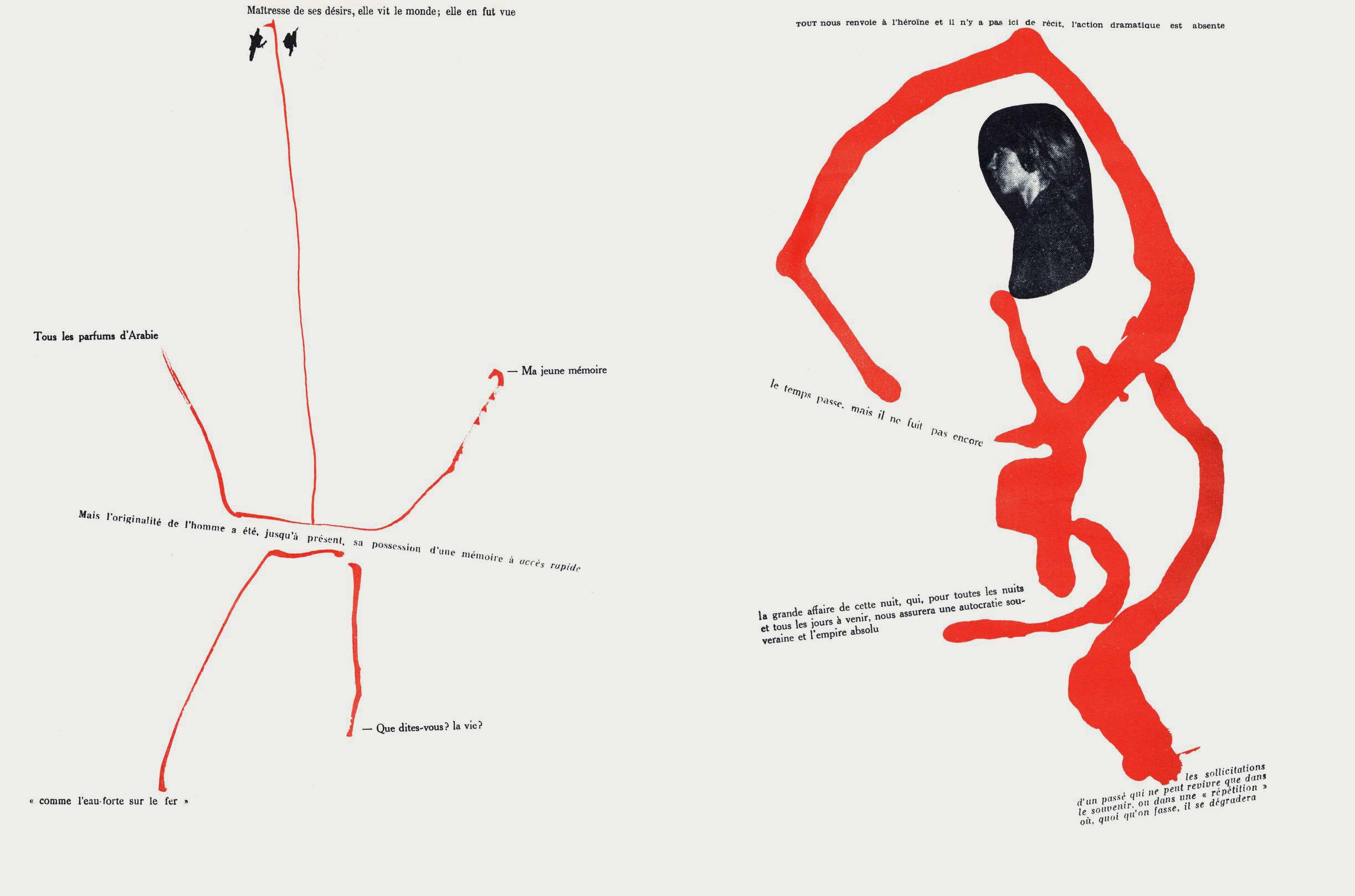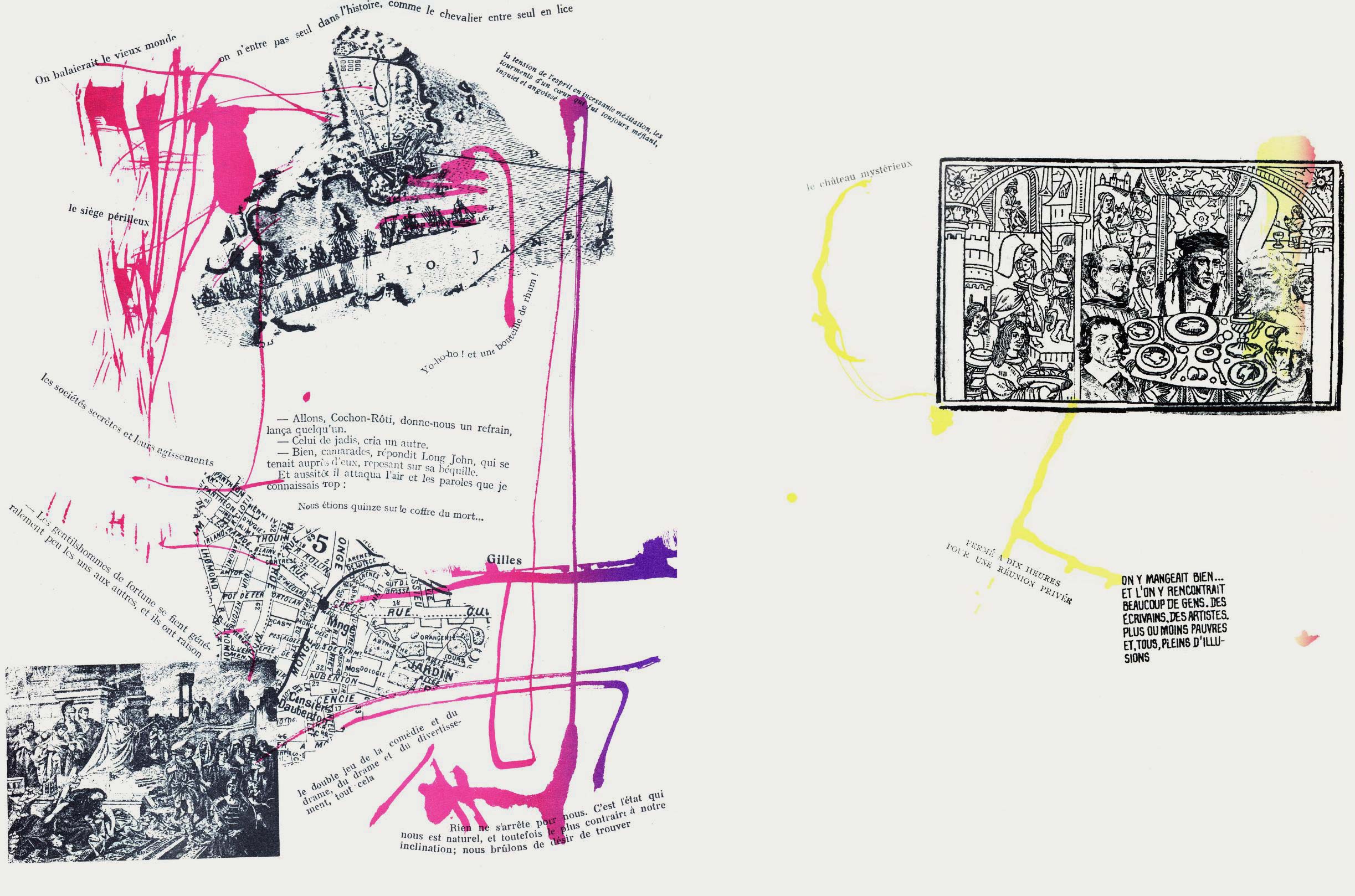 NOTES: Mémoires (Memories) is an artist's book made by the Danish artist Asger Jorn in collaboration with the French artist and theorist Guy Debord. The work contains two separate layers. The first is printed with black ink, reproducing found text and graphics taken from newspapers and magazines. The second layer is printed using coloured inks, splashed across the pages..